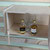 Ein schmales Regal als Ablagefläche für diverse Utensilien.